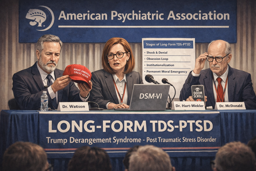 WASHINGTON, D.C. — In what it called “a necessary update for the modern age,” the American Psychiatric Association announced that the forthcoming DSM-VI will include a brand-new psychosis category: Long-Form Trump Derangement Syndrome–Post Traumatic Stress Disorder (LF-TDS-PTSD).